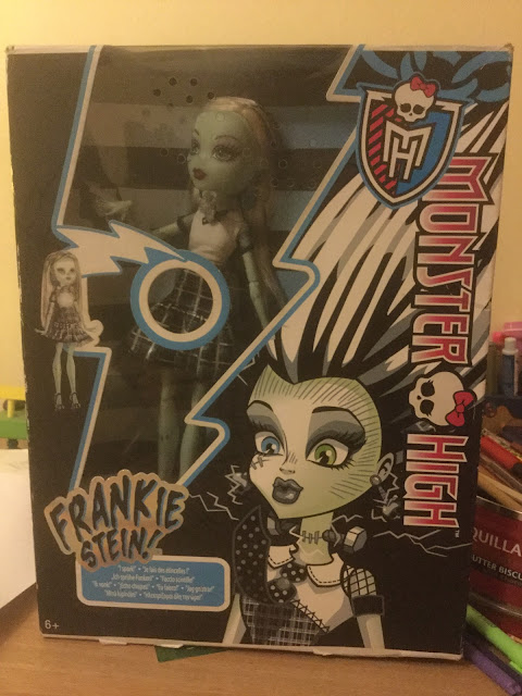 Frankie Stein Ghouls Alive:Ella la consegui por 15 euros a una chica que me la vendió por Wallapop.No tardó mucho en llegarme en una caja que está algo estropeado y la cara tiene algunas manchas.Pero a pesar de eso , estoy completamente electrizada con esta adquisición a mi colección ya que siempre quise tener una Ghouls Alive que estaría entre Spectra , Frankie o Rebecca.Pero finalmente elegí a esta electrizante monstruita que brilla o echa chispas como dice la caja de esta muñeca.Sin olvidar que estoy enamorado del art o los artworks que han hecho de Frankie para la colección Ghouls Alive que en España se traduce como Más Vivas que Nunca o Monstruitas Más Vivas que Nunca.